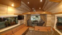 例えばテーブル。構造上、1本脚のためガタつきがありますが、壁側に設置できますしキャンプ用の折り畳みのテーブルを使う方法もあります。YouTube『すえぽんチャンネル SueponChannel』さんも、ビルダーさんに依頼して、テーブル等、いろいろカスタムしてもらっています。