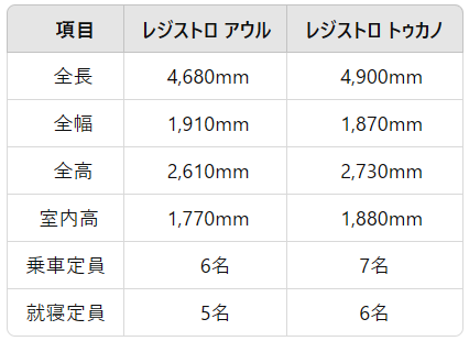 アウルと比べるとベース車の差額分(おそらく130万円程度)、お値段はアップしますたが、レジストロトゥカノがリチウムイオン、丸窓など多くのオプションが標準装備になったことで、単純に高いとも言えない。オプション込みの総額で比較する必要があります。
